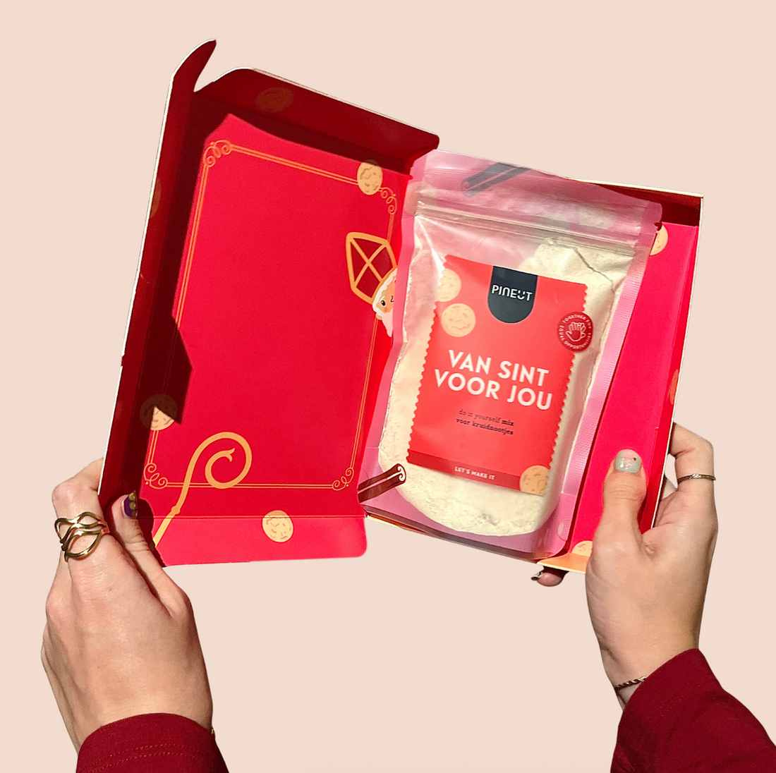 Sinterklaas vier je het allerlekkerst met de geur van versgebakken kruidnoten. Met de DIY kruidnotenmix van Pineut haal je een écht traditioneel Sinterklaasmoment in huis. Deze complete bakmix wordt geleverd in een feestelijk brievenbusdoosje dat eruitziet als het Grote Boek van Sinterklaas — een origineel Sinterklaas cadeau én ideaal brievenbuscadeau.