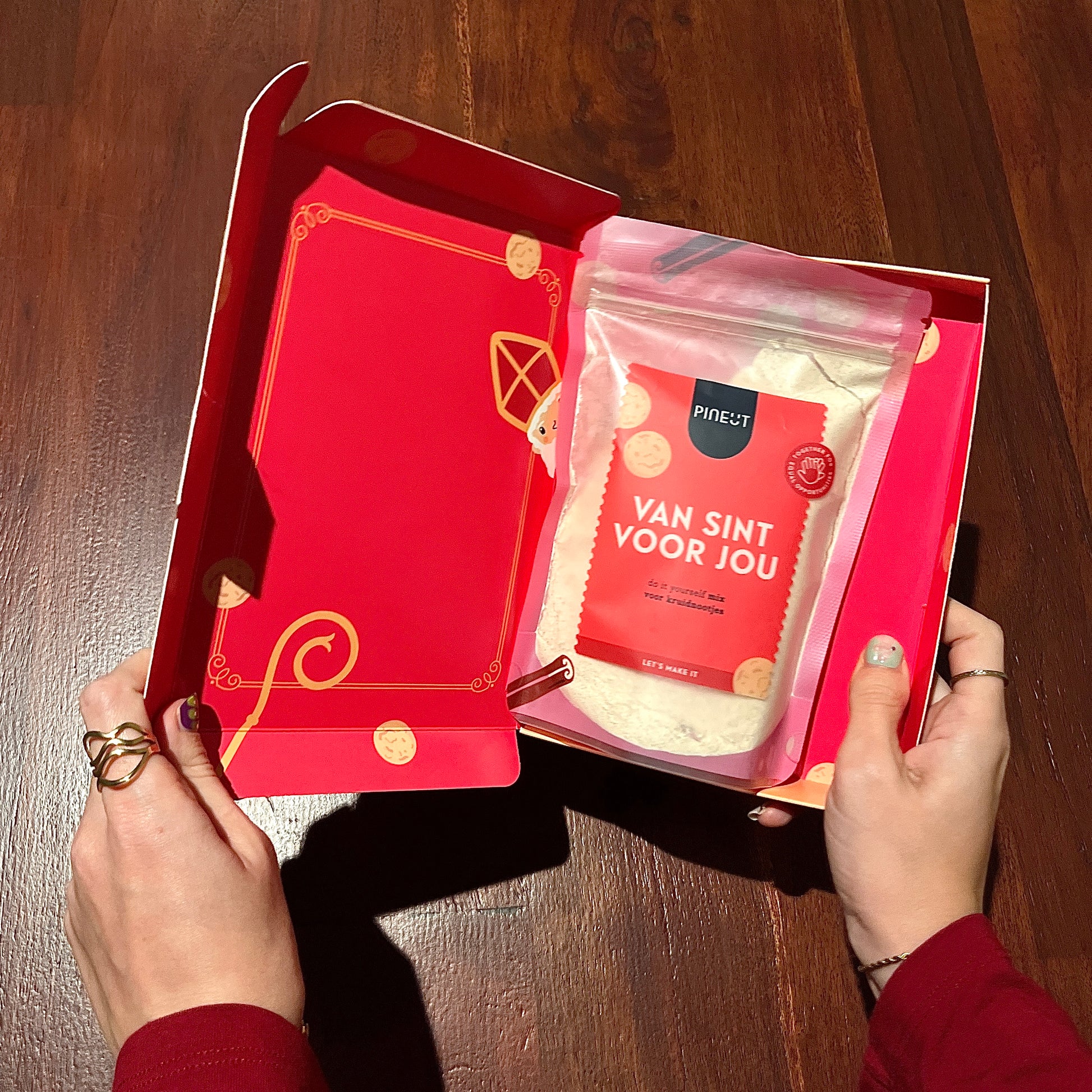 Sinterklaas vier je het allerlekkerst met de geur van versgebakken kruidnoten. Met de DIY kruidnotenmix van Pineut haal je een écht traditioneel Sinterklaasmoment in huis. Deze complete bakmix wordt geleverd in een feestelijk brievenbusdoosje dat eruitziet als het Grote Boek van Sinterklaas — een origineel Sinterklaas cadeau én ideaal brievenbuscadeau.